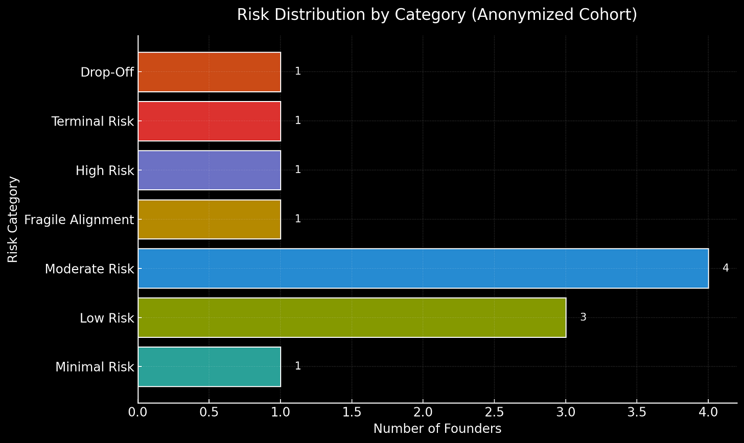 The fragile middle is where most founders live. The majority showed progress, but tangled in entropy, incomplete execution, or unproven signals.