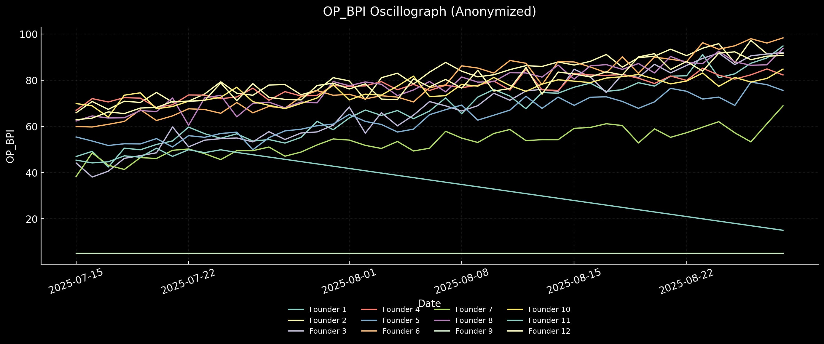 “The numbers tell the story: one founder reached the 90s, several lived in the 80s and 70s, one dropped into the 40s, one suppressed in the 50s, and one flatlined into the teens. That distribution is not random — it is the fingerprint of founder transformation.”