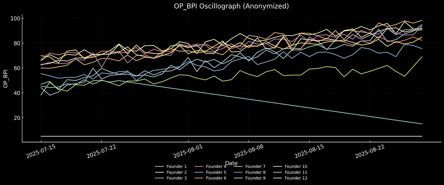 Breakthrough states can be identified and validated. The system caught, with precision, a founder moving into genuine, compounding credibility.